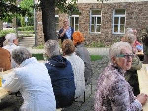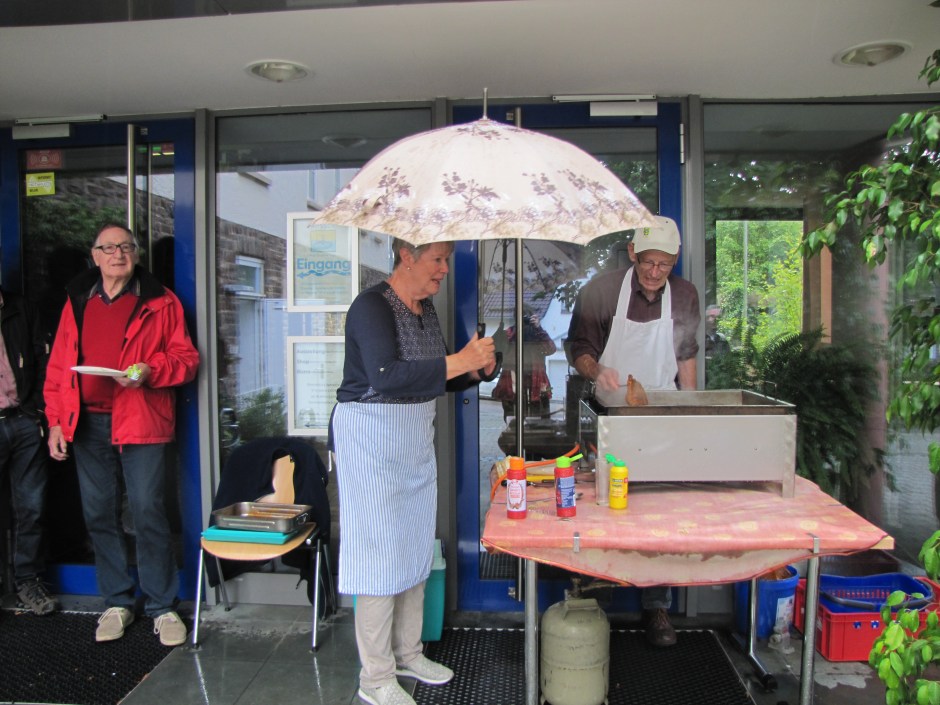 Das Wetter war durchwachsen beim diesjährigen Sommerfest der „Jungen Alten“. Konnte die Vorsitzende Hilde Amrein ihre Mitglieder noch bei Sonnenschein begrüßen, tobte kurze Zeit später ein heftiger Sturm mit Regen über den Platz des WIZE – ausgerechnet zu der Zeit als Würstchen und Koteletts, meisterhaft gegrillt von Hubert Steinborn, serviert werden konnten. Doch das tat der guten Laune keinen Abbruch. Jeder nahm sein Tellerchen und suchte sich in den Werkräumen einen Platz, wo Helmut Breuer die Festgäste fürsorglich mit Getränken versorgte.