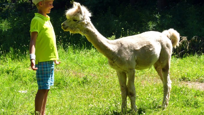 Enkel Luis freut sich über die Begegnung mit einem Alpaka. Foto: Gisela Röttgen
