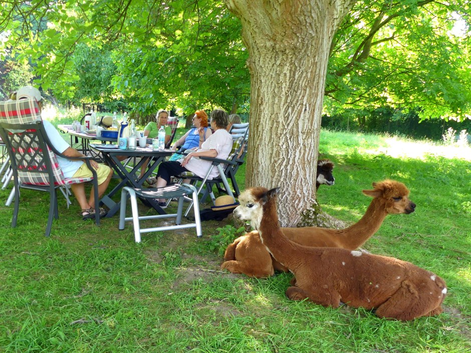 Selten hat ein Ausflug den „Jungen Alten“ so viel Vergnügen bereitet. Die Begegnung mit Alpakas, den sanften Andenbewohnern, ist ein ganz besonderes Erlebnis. Vergessen ist, dass eigentlich ein Wandertag mit den Tieren auf dem Programm stand. Es ist einfach zu heiß. Deshalb hat sich Anne Knein entschlossen, zu Kaffee und Kuchen auf die Wiese einzuladen. Und das ist mindestens ebenso schön.