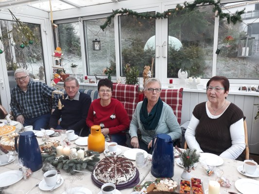 Wer Boule spielt, darf auch Kuchen essen. Das dachte sich Hannelore Züll (rechts im Bild), als sie die Mitglieder ihrer Boule-Gruppe zum weihnachtlichen Kaffeetrinken in ihren Wintergarten einlud. In gemütlicher Runde wurde über das vergangene Vereinsjahr geplaudert. Die Vorfreude auf die neue Saison ist groß, denn die Boule-Gruppe hat bei den „Jungen Alten“ mittlerweile viele begeisterte Freunde gefunden. ush