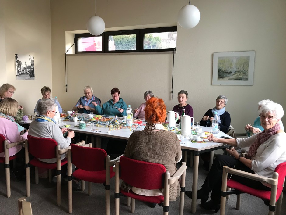 Die Handarbeitsgruppe um Karin Breuer (ganz rechts im Bild) bewies, dass auch in der Karnevalszeit in gemütlicher Runde gestrickt und gehäkelt werden kann. Der Tisch war reichlich geschmückt mit Luftschlangen und Konfetti. Es gab Kaffee und selbst gebackene Mutzen, die – so ein Geheimtipp – nach dem ersten Bissen mit Eierlikör gefüllt werden konnten und besonders köstlich schmeckten.