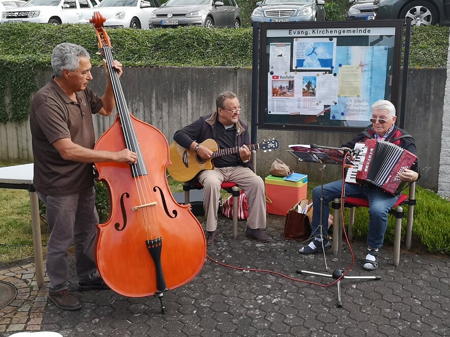 Das diesjährige Sommerfest der „Jungen Alten“ fand zum ersten Mal auf dem Vorplatz der evangelischen Kirche, EvA am Schönblick, statt. Auch in Corona-Zeiten ließen es sich mehr als 30 Mitglieder nicht nehmen, in fröhlicher Runde zu feiern. Frank am Akkordeon, Jürgen an der E-Gitarre und Mohamed am Bass sorgten für gute Stimmung, und die Vorsitzende Hilde Amrein trug zur allgemeinen Freude „eine etwas andere Schöpfungsgeschichte“ vor. Essen und Trinken hatte diesmal jedes Mitglied selbst mitgebracht – nach dem Motto: Wenn wir in diesem Jahr schon kein „Picknickkonzert“ veranstalten können, wollen wir wenigstens im kleinen Kreis picknicken. ush