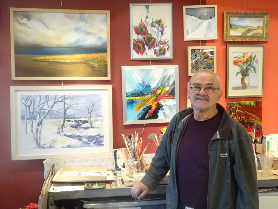 Vor allem die Landschaftsmalerei hat es ihm angetan: In seinem Atelier hängen stimmungsvolle Studien von Eifellandschaften und Impressionen aus dem Hohen Venn. Im früheren „Haus des Gastes“ war er erfolgreich mit dem Verkauf seiner Arbeiten, und er zeigte bei rund 80 Gruppenausstellungen in Frankreich, Österreich, Belgien und Deutschland sein Können. Auch in der Volksbank Heimbach war er mit seinen Bildern schon zu Gast. Doch diesmal sind seine Schüler an der Reihe. Nach einer Ausstellung beim letzten Stadtfest ist das die zweite Gelegenheit seiner Gruppe, sich dem Publikum zu zeigen. „Während der Geschäftszeiten kann jeder kommen und sich die Bilder anschauen“, sagt er. „Ich freue mich sehr, dass uns diese Möglichkeit gegeben worden ist.“