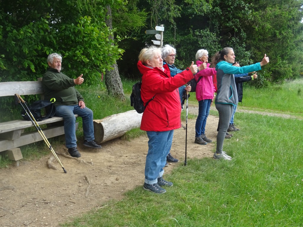 Immer wieder lud Sylvia Calimeris zu Achtsamkeit und Stille ein. Der Vogelgesang war keine Nebensache mehr, sondern eine bewusst wahrgenommene Attraktion. Die unterschiedlichen Waldabschnitte öffneten die Augen: Hier der statische, fast tot wirkende Nadelwald, dort die Lebendigkeit des wuchernden Mischwaldes. An einzelnen Stationen wurde Yogagehen als Meditation geübt, durfte im Wasser des wilden Wüstebachs geplanscht werden. Und die Schilder des „Schöpfungspfads“ mit ihren biblischen und literarischen Aufschriften luden zum Nachdenken ein.