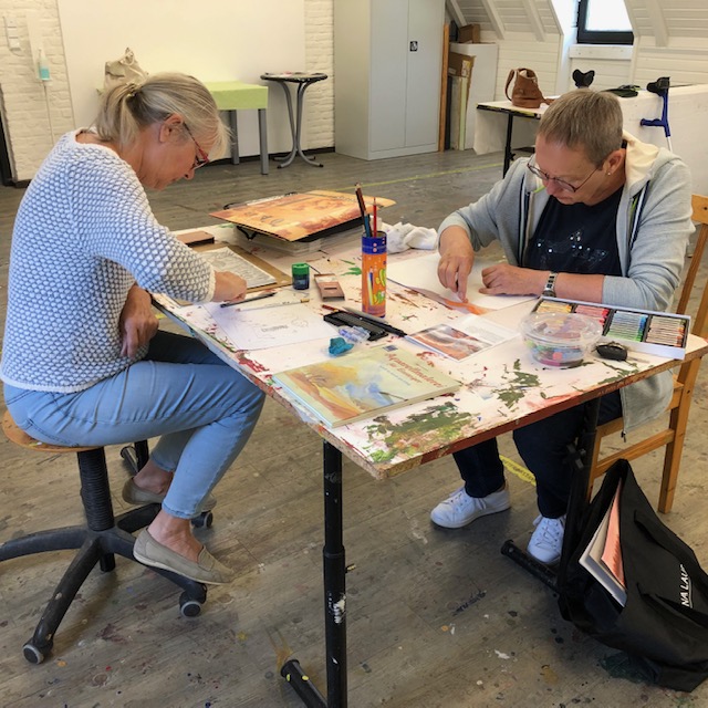 „Bevor ich hierherkam, habe ich vor allem Porträts gemalt“, sagt zum Beispiel Doris Kerp. „Nun wage ich mich auch an andere Motive.“ Man sieht es ihr und den anderen Teilnehmerinnen an. Sie sind konzentriert und voller Freude, fast meditativ bei der Sache und wagen sich auch an Experimente.