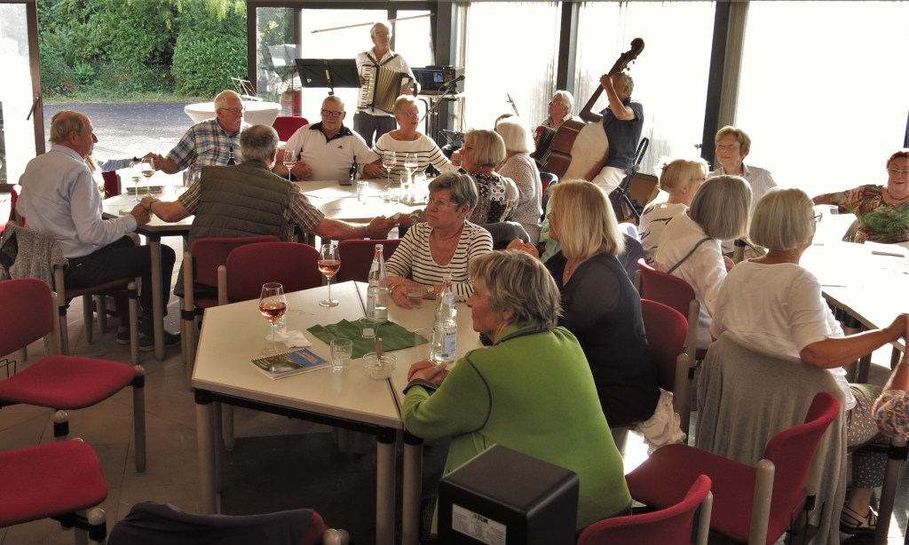 Musik und Mitsing-Lieder präsentierten Frank Ledig (Akkordeon), Wolfgang Schmidt (Akkordeon) und Mohamed Bidaoui am Bass (Foto oben mit Hilde Amrein). Und das werte Publikum ließ sich nicht zweimal bitten: Es sang mit, klatschte und schunkelte, sei es bei einem Chancon wie „Ganz Paris träumt von der Liebe“ oder beim Volkslied „Ein Heller und ein Batzen.“ Viel Stimmung an einem Sommerabend. ush