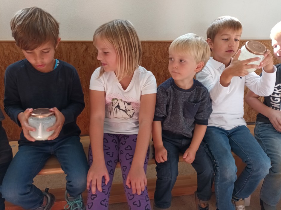 Die Bäckereien durften von den Kindern sofort nach dem Abkühlen mit der selbst fabrizierten Butter gegessen werden. Ein leckerer Nachmittag mit einer lehrreichen Lektion über das Leben von Uroma und Uropa in der Eifel. Unsere Fotos zeigen die Kinder mit der Schüttelbutter im Glas.      ush