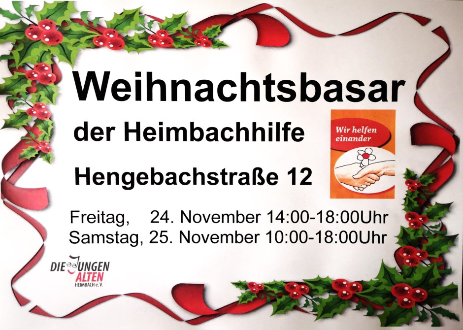 Die Heimbachhilfe bietet in diesem Monat ihre Waren gleich an zwei Orten an: Am Freitag, 24. November, von 14-18 Uhr, und am Samstag, 25. November, von 10-18 Uhr, stellen die Mitarbeiterinnen Weihnachtsdekoration an der Hengebachstraße 12 aus. Jeder ist herzlich eingeladen, in gemütlicher Atmosphäre nach Engelchen, Nikoläusen oder Weihnachtssternen zu suchen.