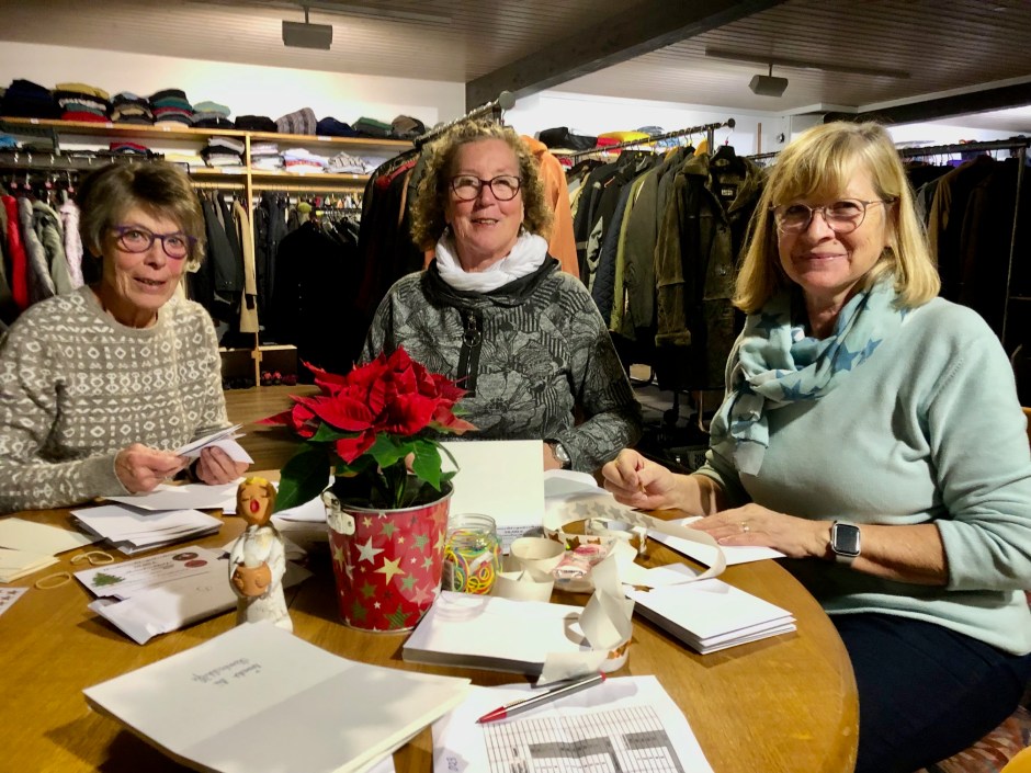 Vielleicht ist das der schönste Termin im Jahr für die Leiterinnen der Heimbachhilfe, Ingrid Wergen, Marianne Schimang und Marja Schöller (auf unserem Foto von links): Alle Jahre wieder treffen sie sich in der Adventszeit, um die Gutscheine für die Weihnachtsaktion der „Jungen Alten“ mit den besten Festtagswünschen in hübsche Umschläge zu verpacken. Mehrere tausend Euro sind auch in diesem Jahr an Spenden eingegangen und in Warengutscheine umgewandelt worden. Den vielen Spendern sei Dank.