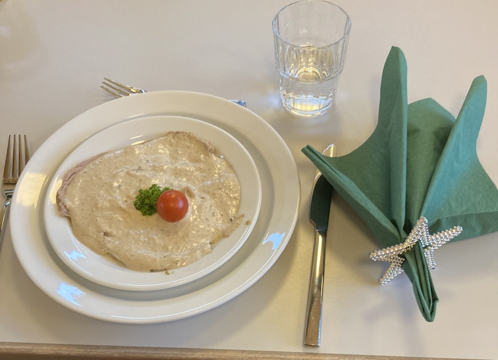 Acht Frauen und ein Mann zählen zum Stammpersonal der Gruppe, und sie schätzen nicht nur die gemeinsame Arbeit und die damit verbundene Geselligkeit, sondern auch das wohlverdiente Essen zur Mittagszeit. Vor allem Vereinsmitglieder, die alleine leben, genießen es, einmal im Monat in Gemeinschaft schmausen zu können, zumal der Tisch immer liebevoll gedeckt ist. Inge Wergen und Ursula Küpper legen Wert auf eine schöne Tischdekoration. Bei jedem Treffen stehen nicht nur dampfende Töpfe im Mittelpunkt, auch der Tafelschmuck findet Beachtung. Wie zu erwarten, war das letzte Treffen in diesem Jahr etwas ganz Besonderes: Kurz vor dem ersten Advent wurde es in der Küche des EvA-Begegnungszentrums weihnachtlich.  Auf dem Speiseplan standen Vitello Tonnato, also feine Kalbfleischscheiben in Thunfischsauce als Vorspeise, Hirschgulasch mit Bandnudeln und Salat zum Hauptgericht und Kaiserschmarren als Nachspeise. „Der Kaiserschmarren war ein ausdrücklicher Wunsch der Teilnehmer“, lacht Inge Wergen, „ganz weihnachtlich war das ja nicht.“ Dafür gab es aber zum Kaffee noch Süßes, das ganz in die Jahreszeit passte: Schneeflockenpralinen, Blätterkrokant und Mandelsplitter. Und als Deko stand ein Adventkranz auf dem Tisch, hübsch drapiert in einer Backform und ganz traditionell in Grün und Rot geschmückt.