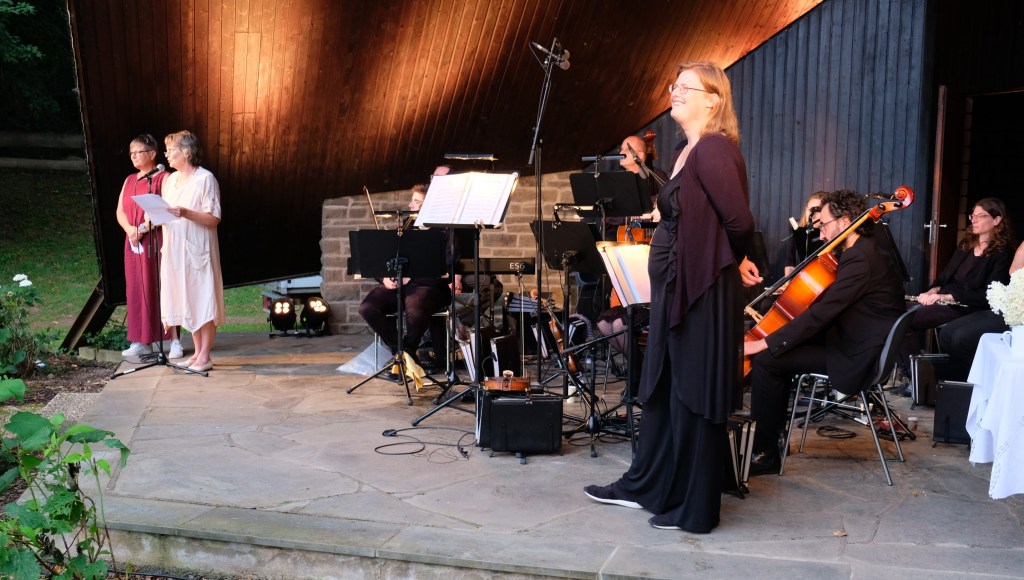 Doch neben der wunderbaren Musik gab es noch einen weiteren Grund, der die Zuschauer auf ihren Stühlchen hielt: Zu vorgerückter Stunde „schwebte“ die „Abendröte“ ein. Die phantastische Figur mit ihren riesigen orangefarbenen Flügeln und der großen Sonne über dem Kopf verzauberte die Zuschauer zweimal mit ihren anmutigen Tänzen´. Zart flatterten ihre Gewänder, weit reichten ihre stoffumfluteten Arme, zärtlich kommunizierte sie mit den Besuchern.