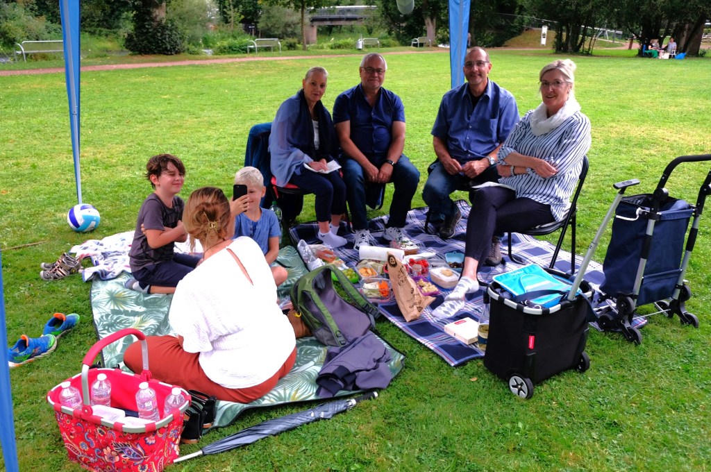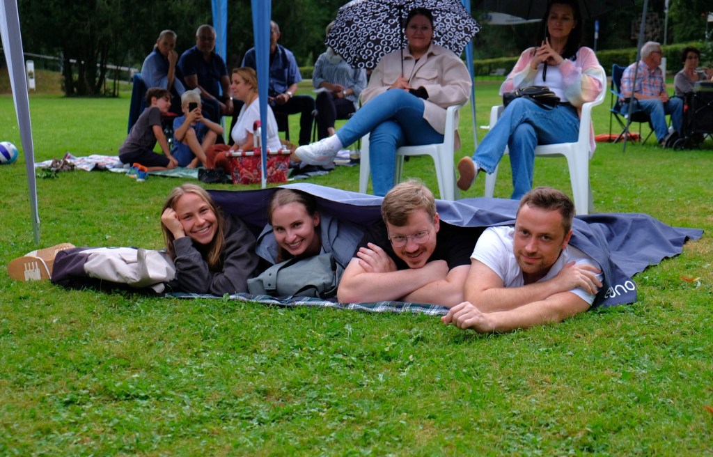 Diesmal grollte der Wettergott dem Picknickkonzert der „Jungen Alten“. Als das „Salonorchester Achso!“ um Punkt 18 Uhr das Fest eröffnete, setzte leichter Nieselregen ein. Feucht blieb es auch in den nächsten Stunden. Und gegen 21 Uhr regnete es sogar in Strömen.