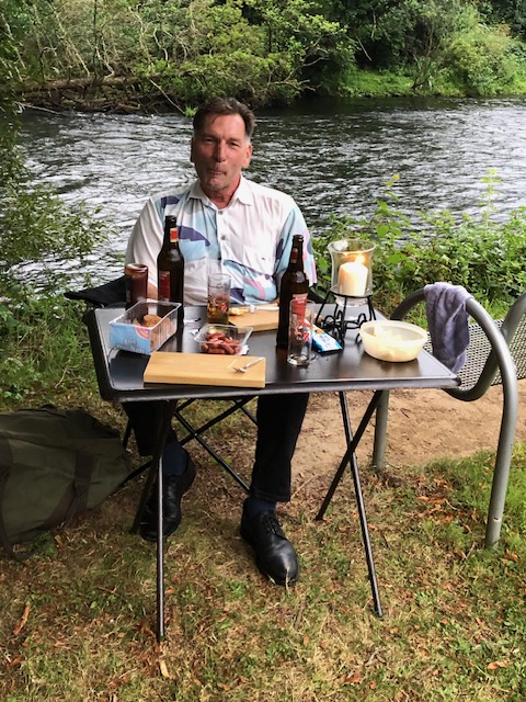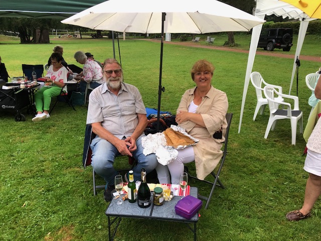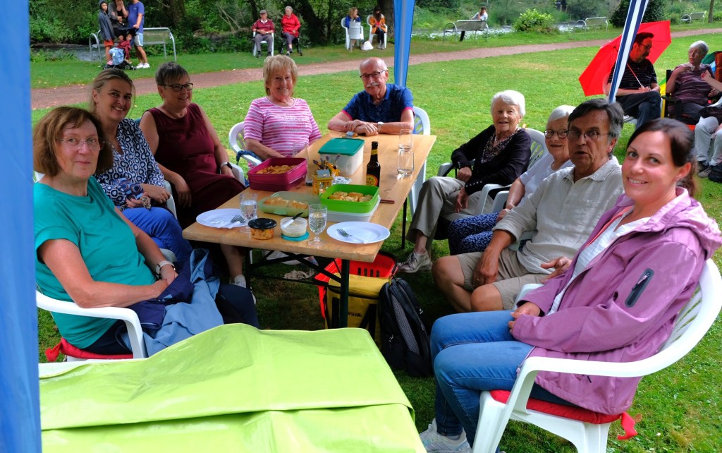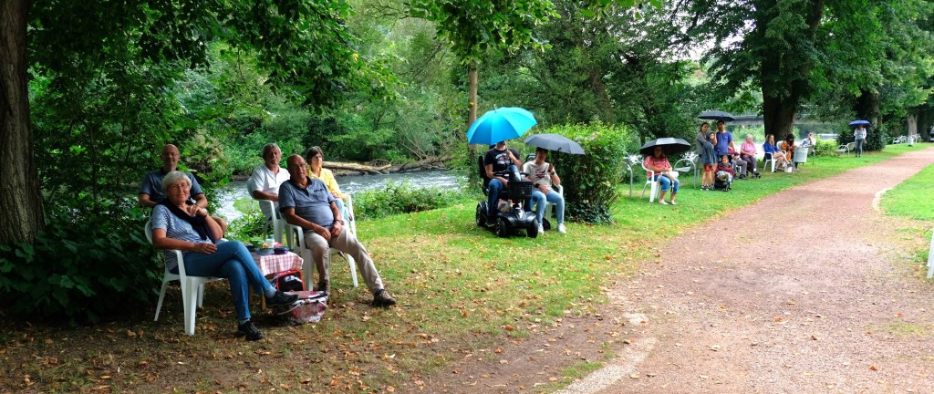Doch, o Wunder: Die meisten der rund 120 Besucher blieben auf ihren Stühlchen sitzen und genossen ihr Picknick mit Musik unter Zeltdächern. Mithilfe des Jugendreferenten der Stadt Heimbach, Dirk Boltersdorf, konnten sechs Pavillons aufgestellt werden, Walter Schöller, stellvertretender Vorsitzender der „Jungen Alten“, und Kassierer Dieter Bodes steuerten vier weitere hinzu. Und schon wurde es für viele gemütlich unter den großen Zeltdächern bei Wein und Kerzenschein. Einige hatten sich selbst ihren „Sonnenschirm“ mitgebracht, andere saßen unter den hohen Parkbäumen an der Rur und versicherten: „Wir bekommen hier keinen Tropfen Regen ab.“