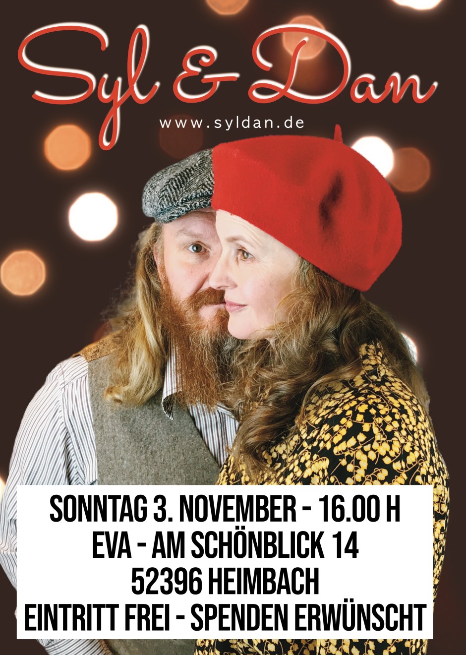 Viele von euch kennen die Beiden: Das Duo Syl & Dan ist bereits in der EvA aufgetreten und hat das Publikum erfreut mit einer Mischung aus Liedern, Geschichten, Humor und Gefühlen. Am Sonntag, 3. November, gastieren sie wieder in Heimbach und zwar ab 16 Uhr im EvA am Schönblick 14. Der Eintritt ist frei, Spenden sind willkommen. Und das erzählt das Paar über sich: