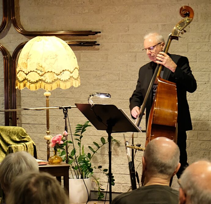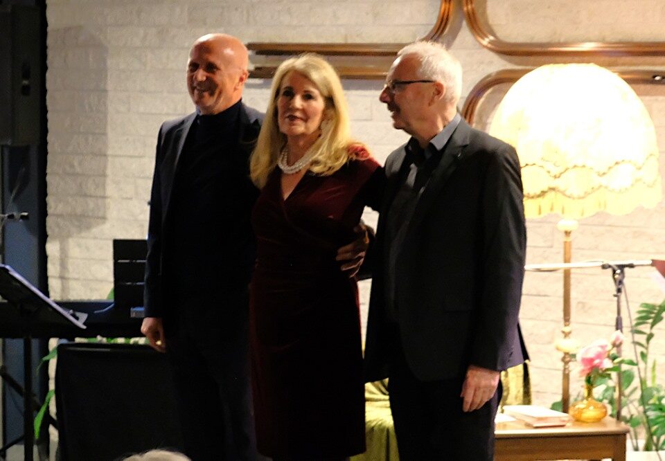 Gaby Koof zur Seite standen der Pianist Andreas Lasonczyk, der die Songs arrangiert hatte, virtuos Jazzelemente setzte und damit einen frischen, neuen Sound kreierte. Großartig. Gerd Brenner brillierte am Bass und gab dem Trio Rhythmus und Tiefe. Ein gelungenes Zusammenspiel, das den Effekt der intimen Kammermusik unterstrich, die das Bühnenbild mit der herrlich altmodischen Stehlampe hervorzauberte.