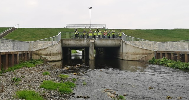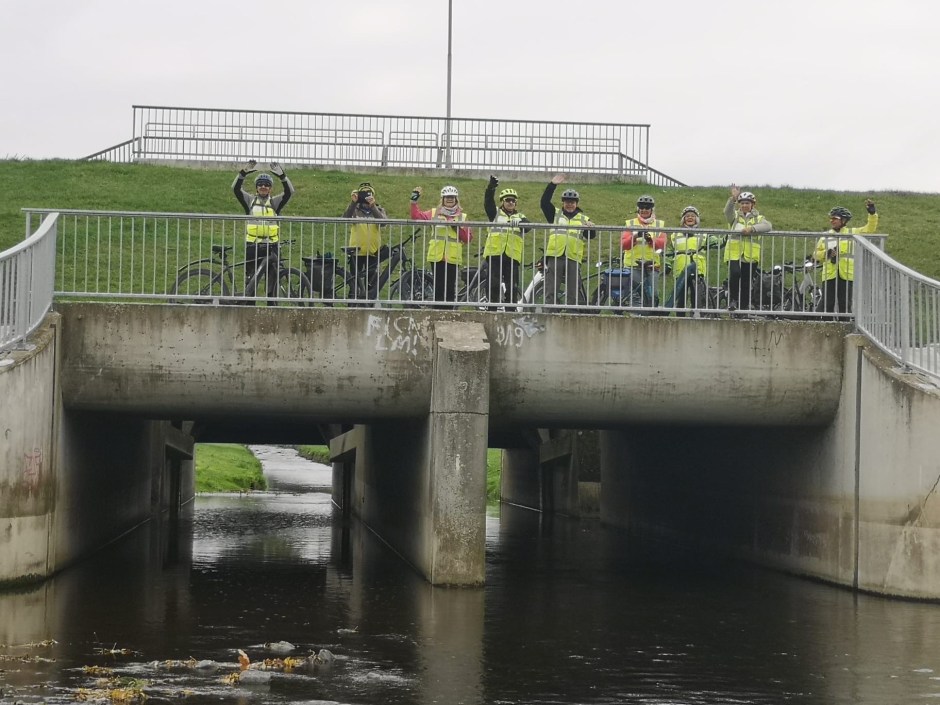 Nach vielen ausführlichen Gesprächen ging es dann wieder auf den Radweg, diesmal in Richtung Euskirchen zurück. Es gab unterwegs einiges zu sehen, zum Beispiel ein riesiges Wasserrückhaltebecken, welches bei Hochwasser große Wassermassen aufnehmen kann und dieses dann kontrolliert an die Erft abgibt.