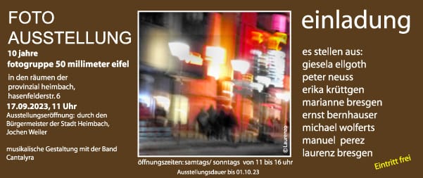 Der Leiter unserer Malgruppe, Ernst Bernhauser, nimmt an einer Gruppenausstellung teil, die am Sonntag, 17. September, eröffnet wird. Gezeigt werden Fotografien, die in der Fotogruppe „50 millimeter eifel“ entstanden sind. Mit der Ausstellung, die von Bürgermeister Jochen Weiler eröffnet wird, feiert die Gruppe ihr zehnjähriges Bestehen. Unser Foto zeigt die Einladung an alle Interessierten.