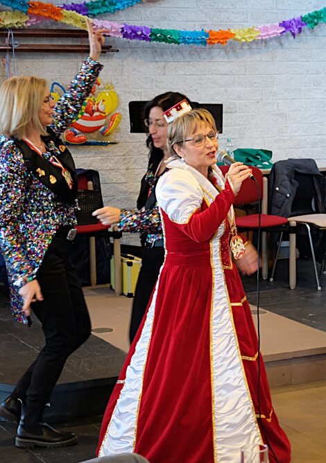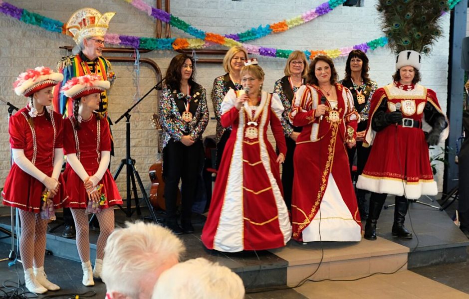 Drei Stunden lang folgte Programmpunkt auf Programmpunkt: Liesel Kulina setzte als „fleißiges Lieschen“ auf Lokalkolorit, Hilde Amrein und Ulrike Schwieren-Höger erinnerten mit dem Song „Ein Loch ist im Eimer“ an einen Spaß der 60er Jahre, als „Tapezierfräuchen“ vergnügte Hannelore Züll das Publikum, Hilde Amrein und Ulla Küpper verblüfften mit dem „Kleiner-Mann-Tanz“ und die beiden „Maatweiber aus Hergarten“, Regina Müller und Andrea Scheidweiler, brachten nicht nur frische Möhren, sondern auch viele Witze mit.