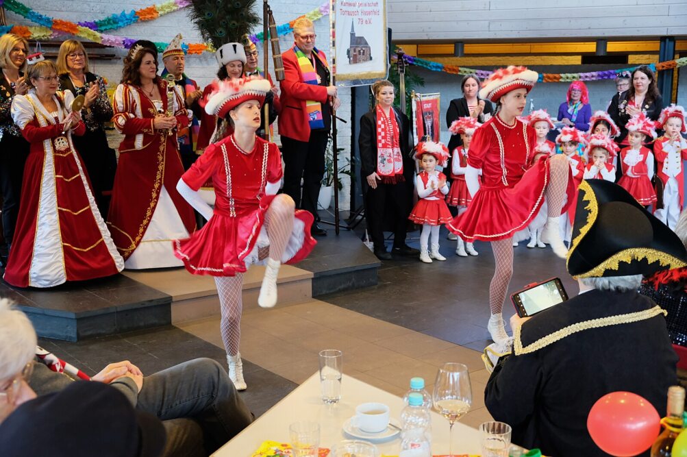 Ein farbenprächtiges Bild (Foto oben) bot das erste Damendreigestirn der KG Torrausch, das Walter Schöller zur Karnevalsparty eingeladen hatte. Voller Stolz stellte Präsident Richard Boje zudem das Synchrontanzpaar Jacqueline und Lea sowie die Tänzerinnen der „Silvergirls“ vor. Die Kinder seiner „Kleinen Garde“ verzauberten die rund 60 Zuschauer mit ihrem Liebreiz.